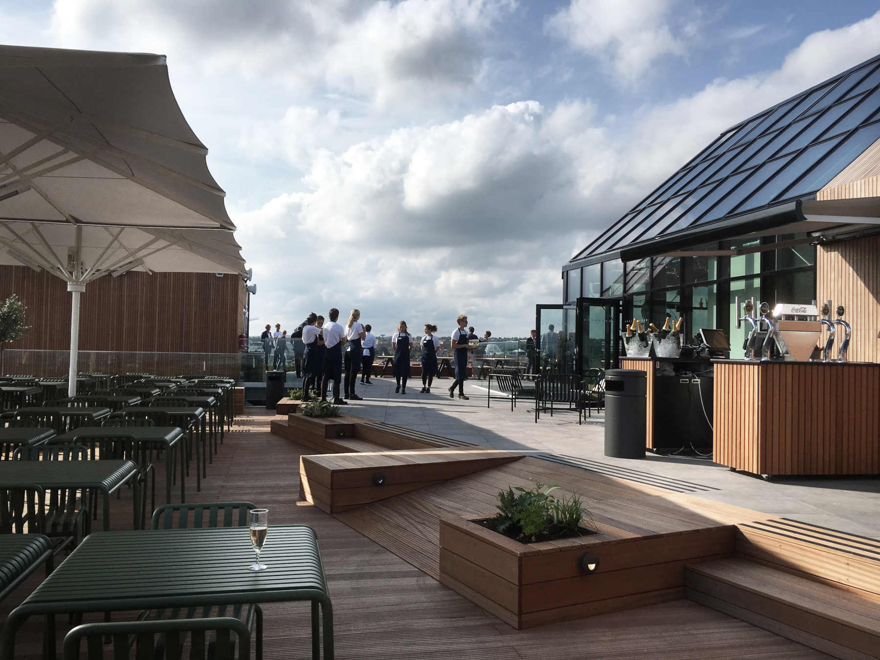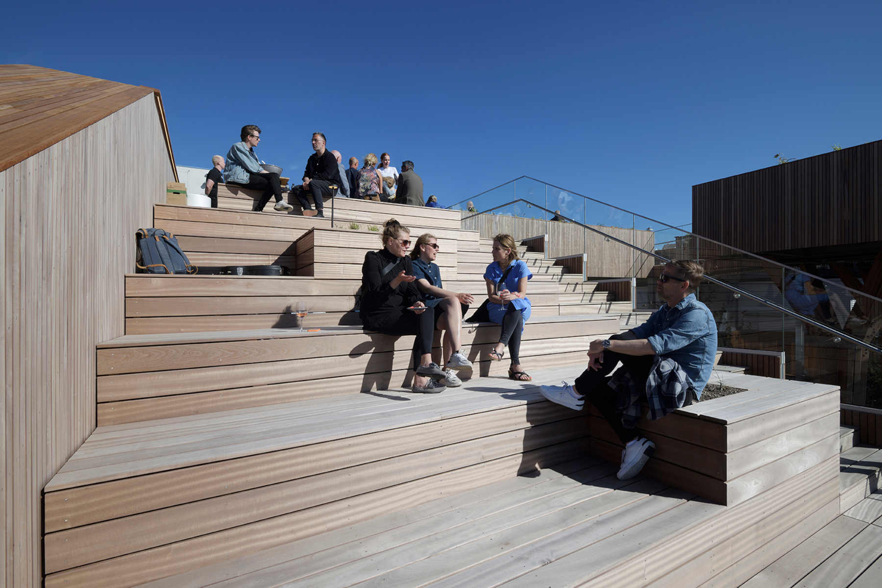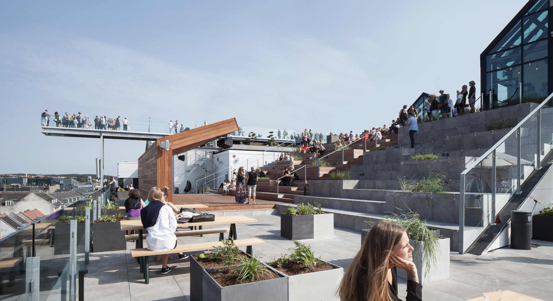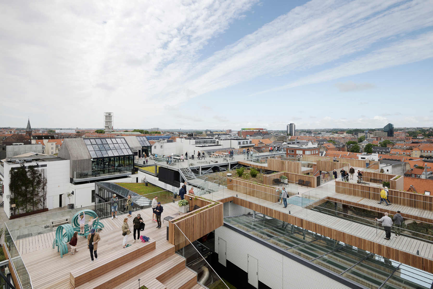 Inspired by Salling Rooftop in Aarhus, a similar space on the rooftop of the Salling Department Store in Aalborg, one year later. Encompassing 1,400 m² across three levels, the Aalborg rooftop includes numerous seating areas, an amphitheater, a café, and a panoramic view of Aalborg – city and fjord.