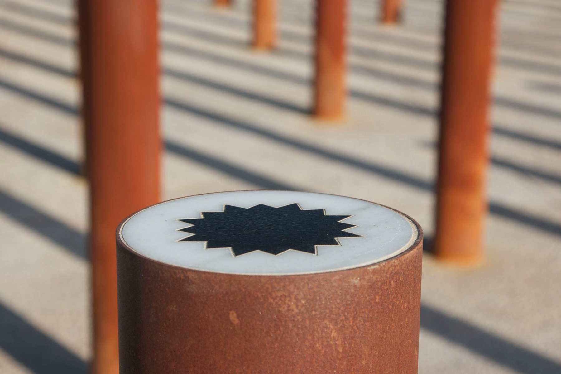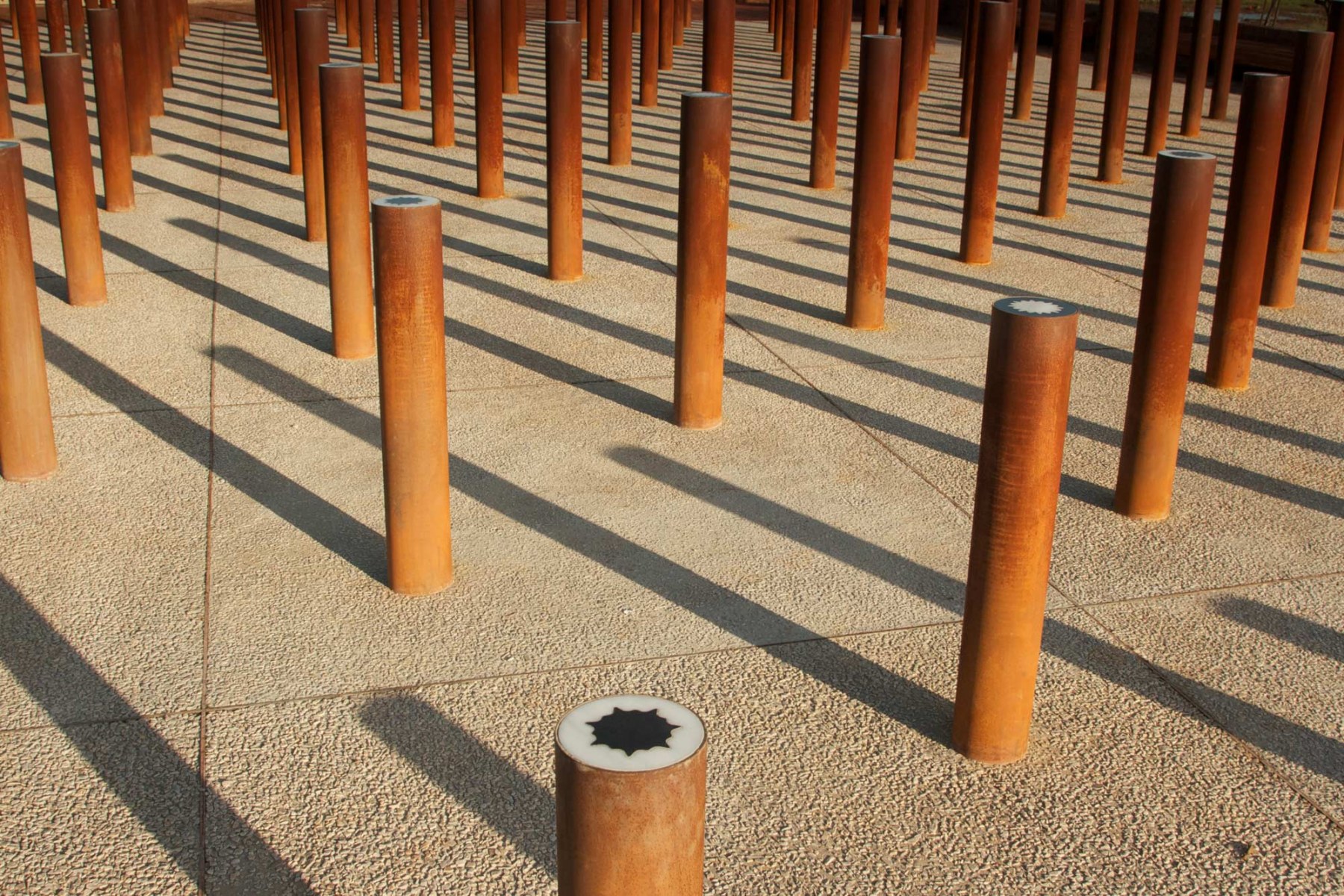 Upon entering the garden that the visitors discover the large open lawn area, the more intimate amphitheatre (consisting of series of lawned terraces looking out to the distant horizon) and the sculpture installation. This installation, by artist Marco Cianfanelli, represents a permanent “bouquet of flowers” and was created by 156 unique vertical raw-steel poles, each finished off with a black and white granite “flower head,” akin to those left daily on graves in the cemetery.