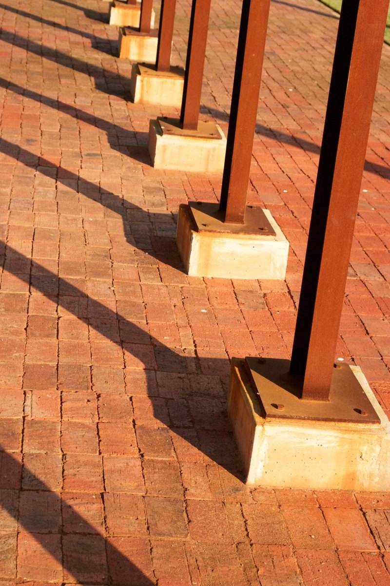 A processional path leads visitors through the cemetery and past the 69 graves. Visitors then progress to the edge of the memorial space and then along the length of a Memorial Wall. This wall is built from locally-sourced clay brick and has a skeletal row of raw-steel columns along its outer edge – each column is topped with a granite flag. These steel columns are representative of people – standing in a row, all facing the same direction. A planter in the top of the wall contains a Freylinia hedge with delicate white flowers which juxtapose the harshness of the steel and granite along the length of the wall.